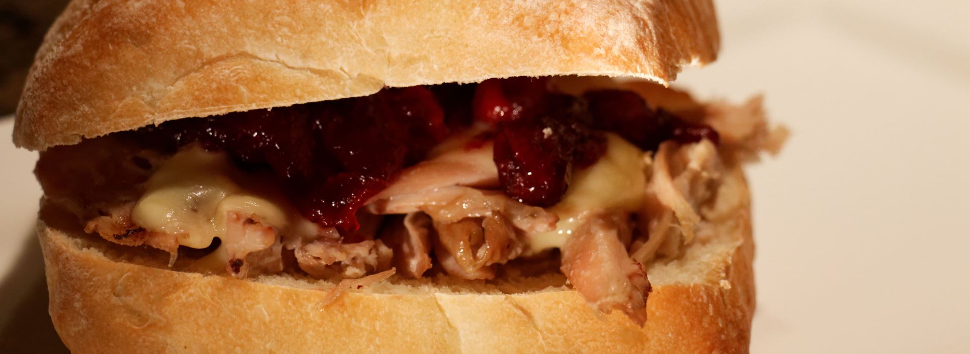 Lighty toasted ciabatta with triple-crème brie, turkey and orange brandy cranberry sauce.