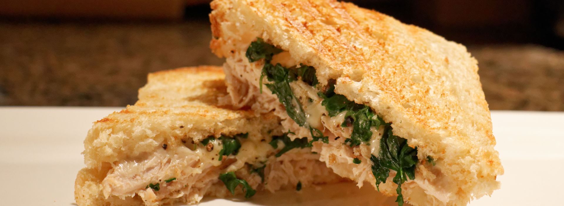 Sourdough panino with chicken, mozzarella and fresh parsley; seasoned with cracked black pepper.